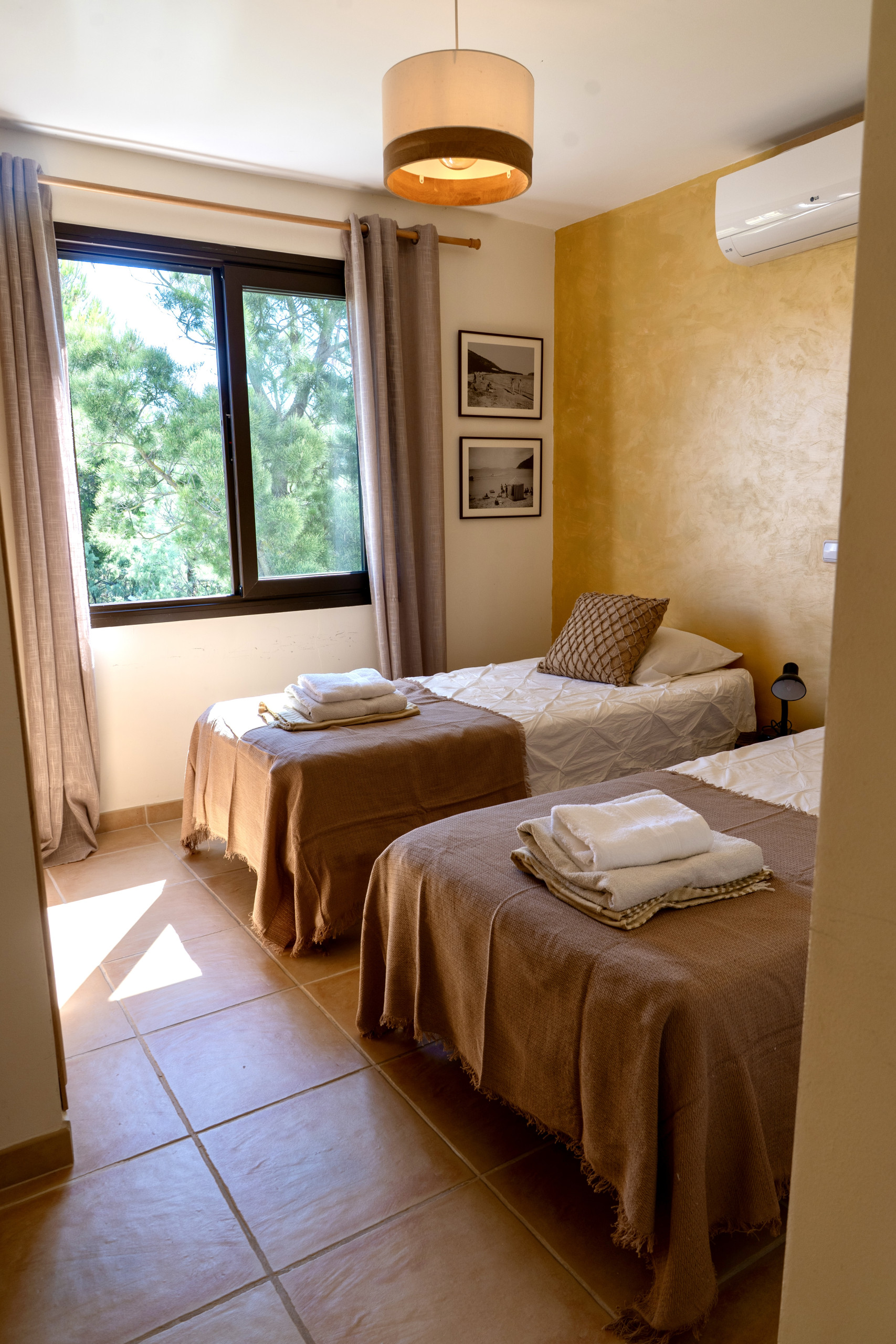 Haus der Sonne hat zwei Schlafzimmer, ein Doppelzimmer und ein Zweibettzimmer. Beide verfügen über eigene Badezimmer. Das Doppelzimmer hat eine Dusche und das Zweibettzimmer eine Dusche und eine Badewanne – ideal für kleine Kinder.