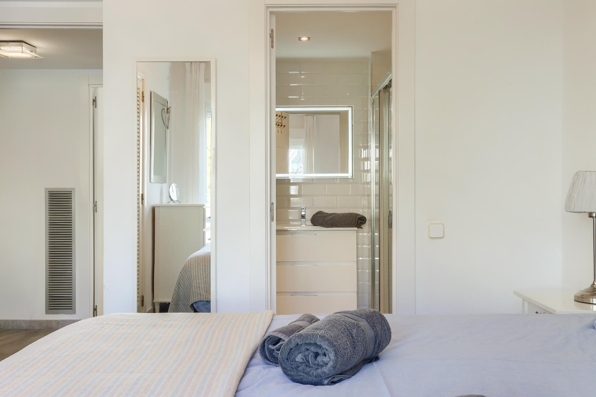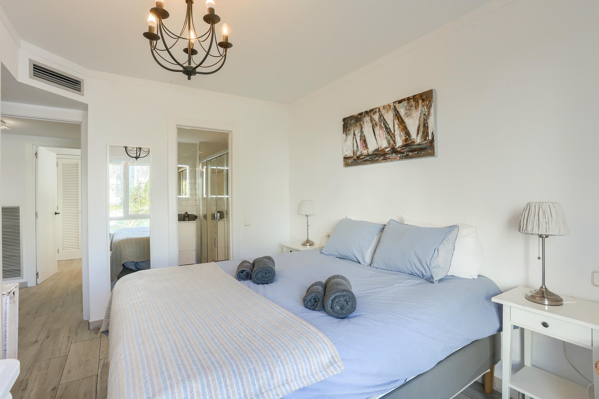 Es gibt drei Schlafzimmer: ein Doppelzimmer mit eigenem Badezimmer, ein zweites Schlafzimmer mit 2 Einzelbetten und ein Schlafzimmer mit Etagenbetten – diese beiden Schlafzimmer teilen sich ein Badezimmer.