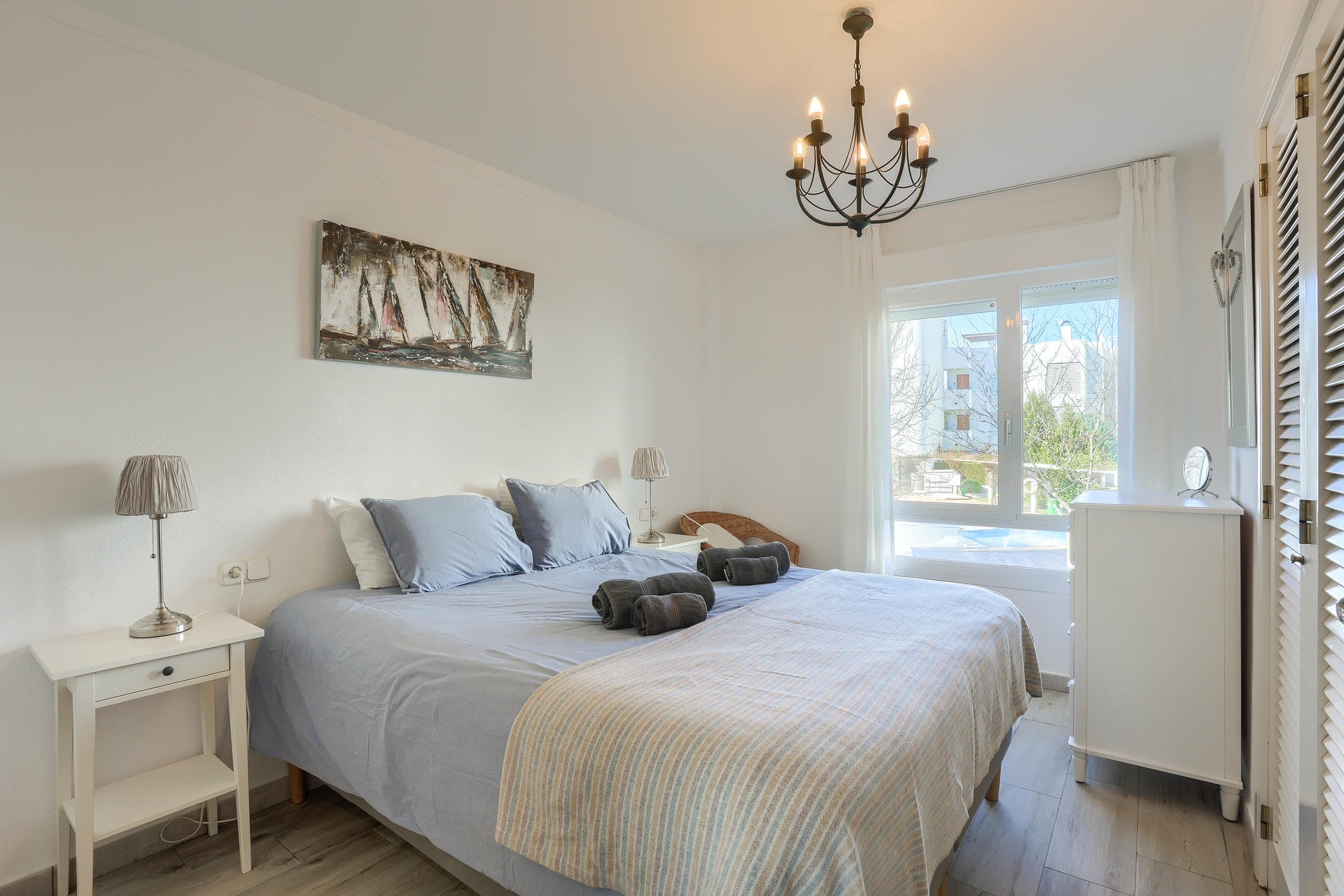 Im Inneren ist die Wohnung gut ausgestattet und enthält viele durchdachte Details. Es gibt ein stilvolles Wohnzimmer mit bequemen Sofas und einem Fernseher mit UK-Kanälen sowie einem Esstisch, an dem sechs Personen Platz finden. Die Küche ist vollständig ausgestattet mit allem, was man benötigt.