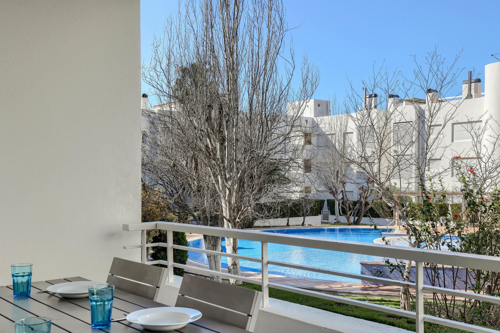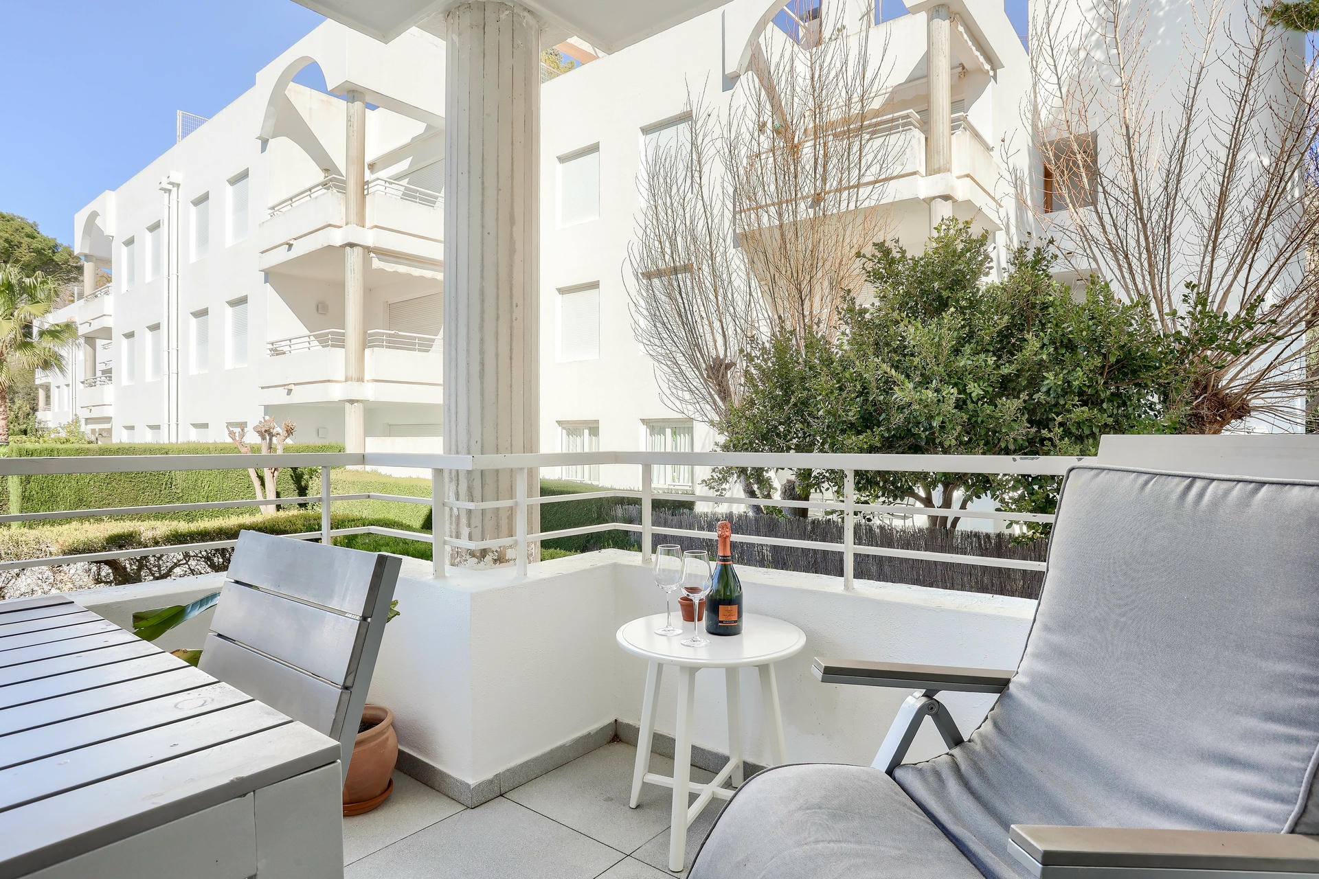 Diese Wohnung befindet sich im Brite-Block. Sie verfügt über eine charmante Terrasse mit einem Esstisch und Stühlen, wo man köstliche Mittagessen mit Blick auf den Pool und die Berge genießen kann.