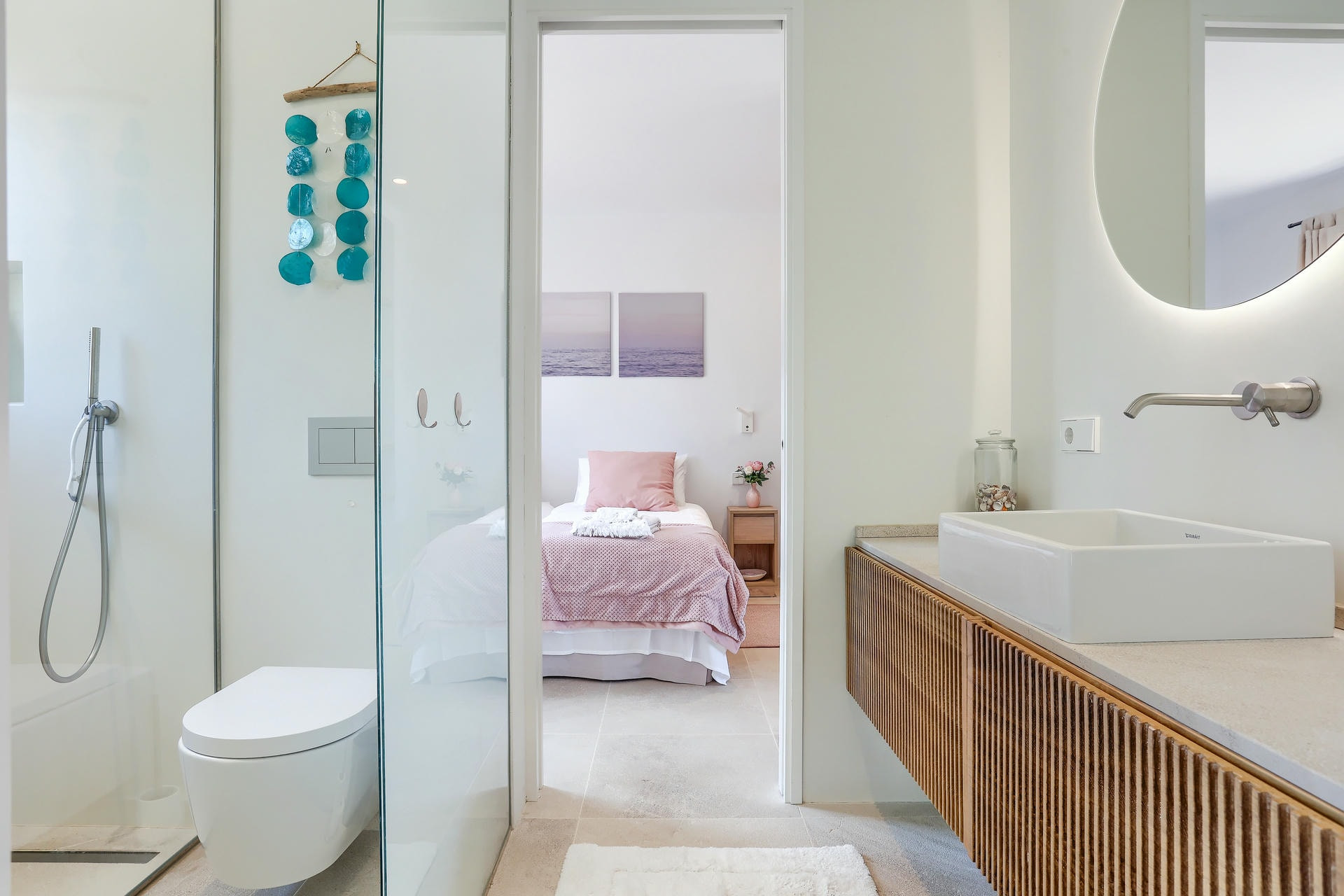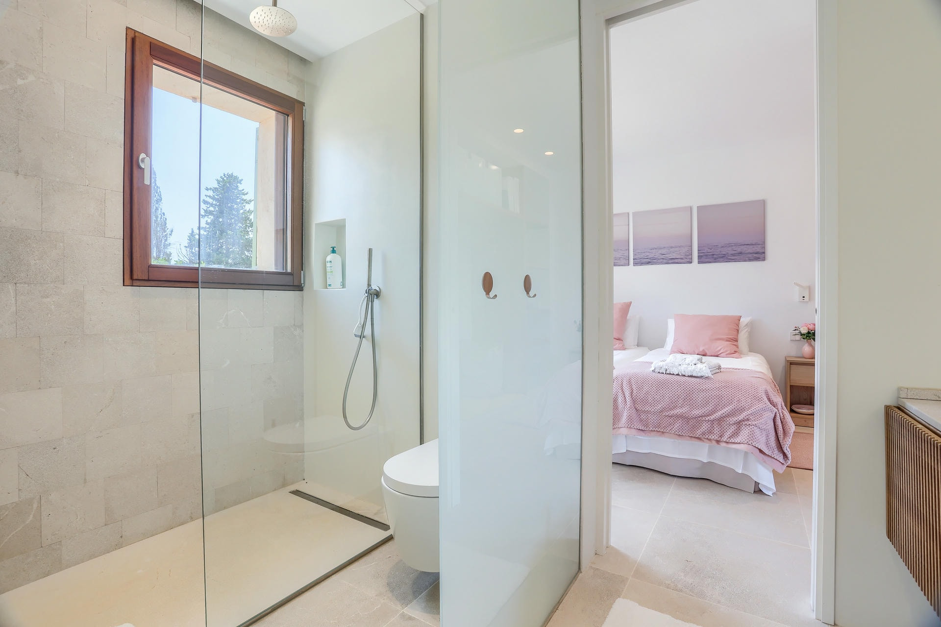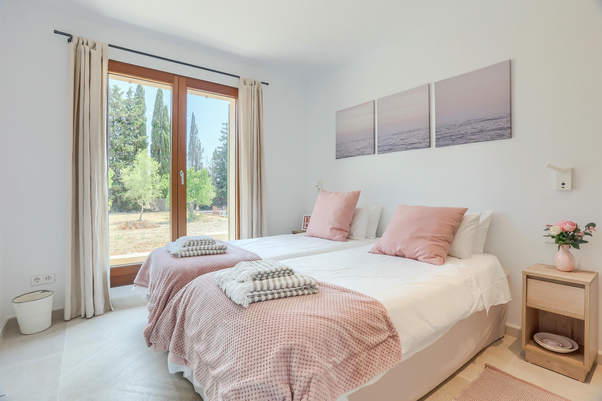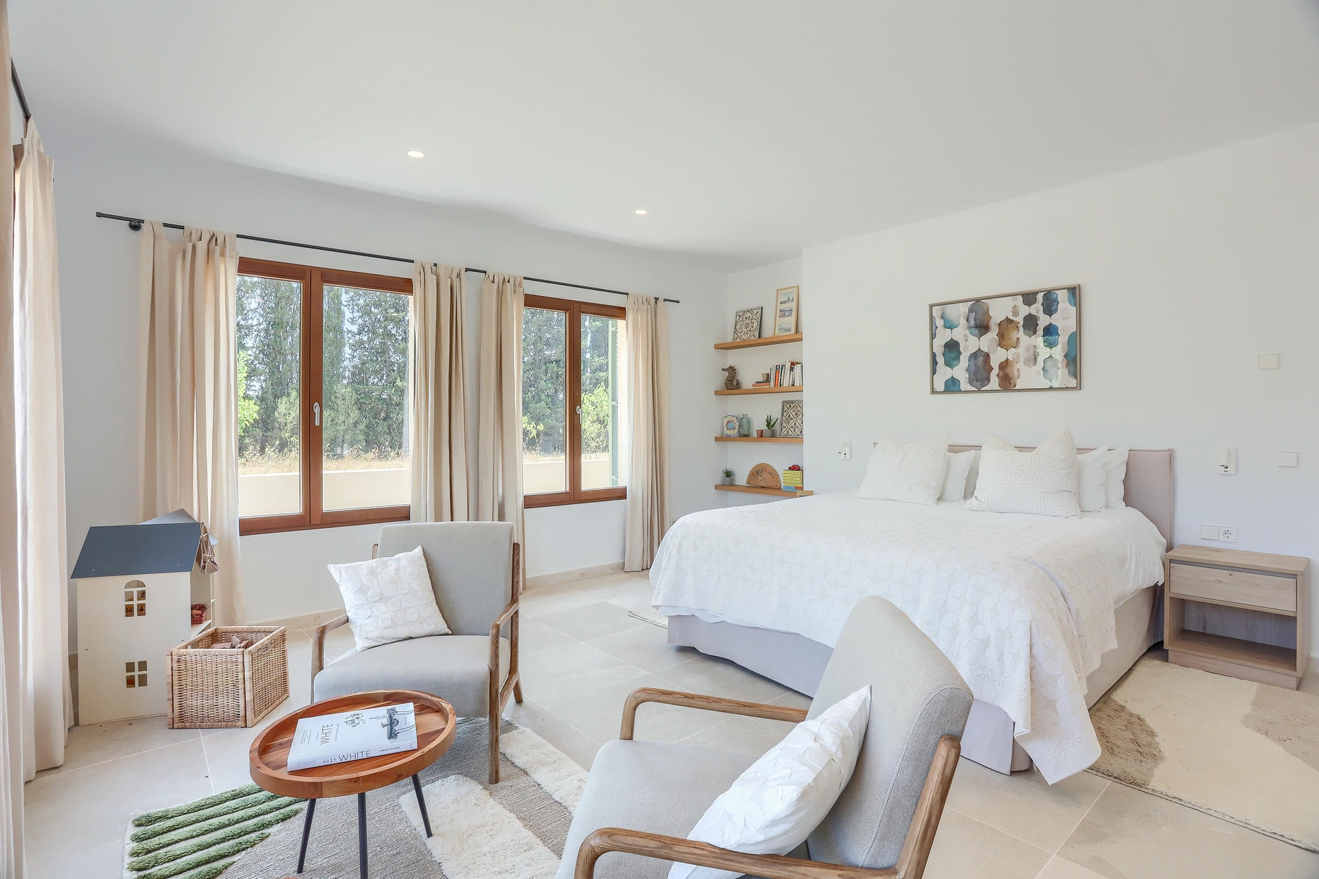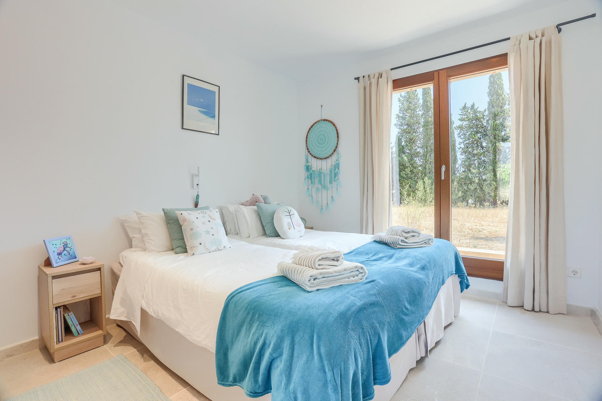 Construida en una sola planta, la villa cuenta con cuatro dormitorios grandes. Dos son dobles suntuosos, ambos con baño en suite, uno de los cuales tiene bañera. Las dos habitaciones gemelas comparten un baño.