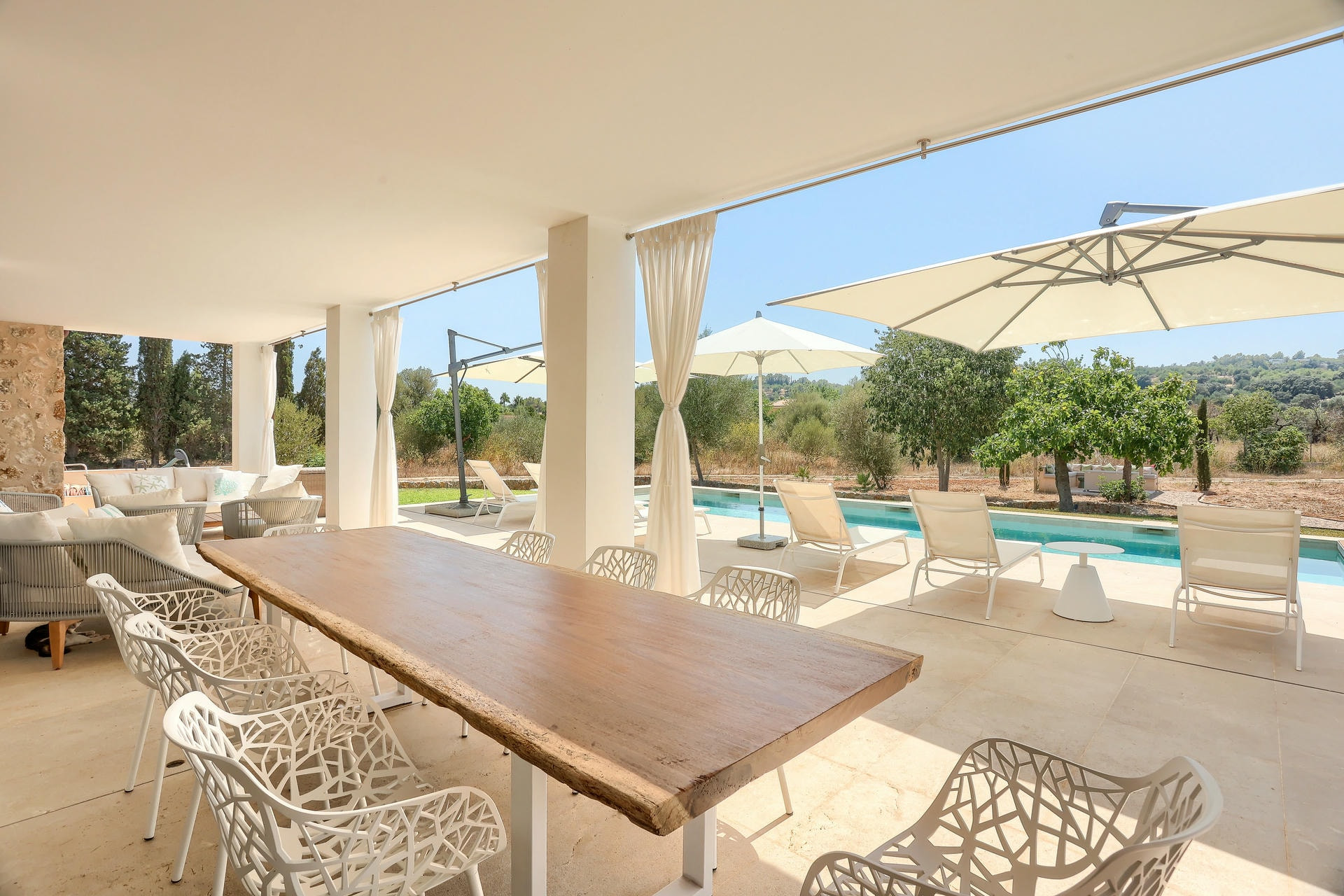 El espacio exterior cumple todos los requisitos. Piscina enorme, muchos asientos al aire libre, una hermosa zona de comedor cubierta al exterior. Numerosos tumbonas y sombrillas. Incluso hay un parque infantil.