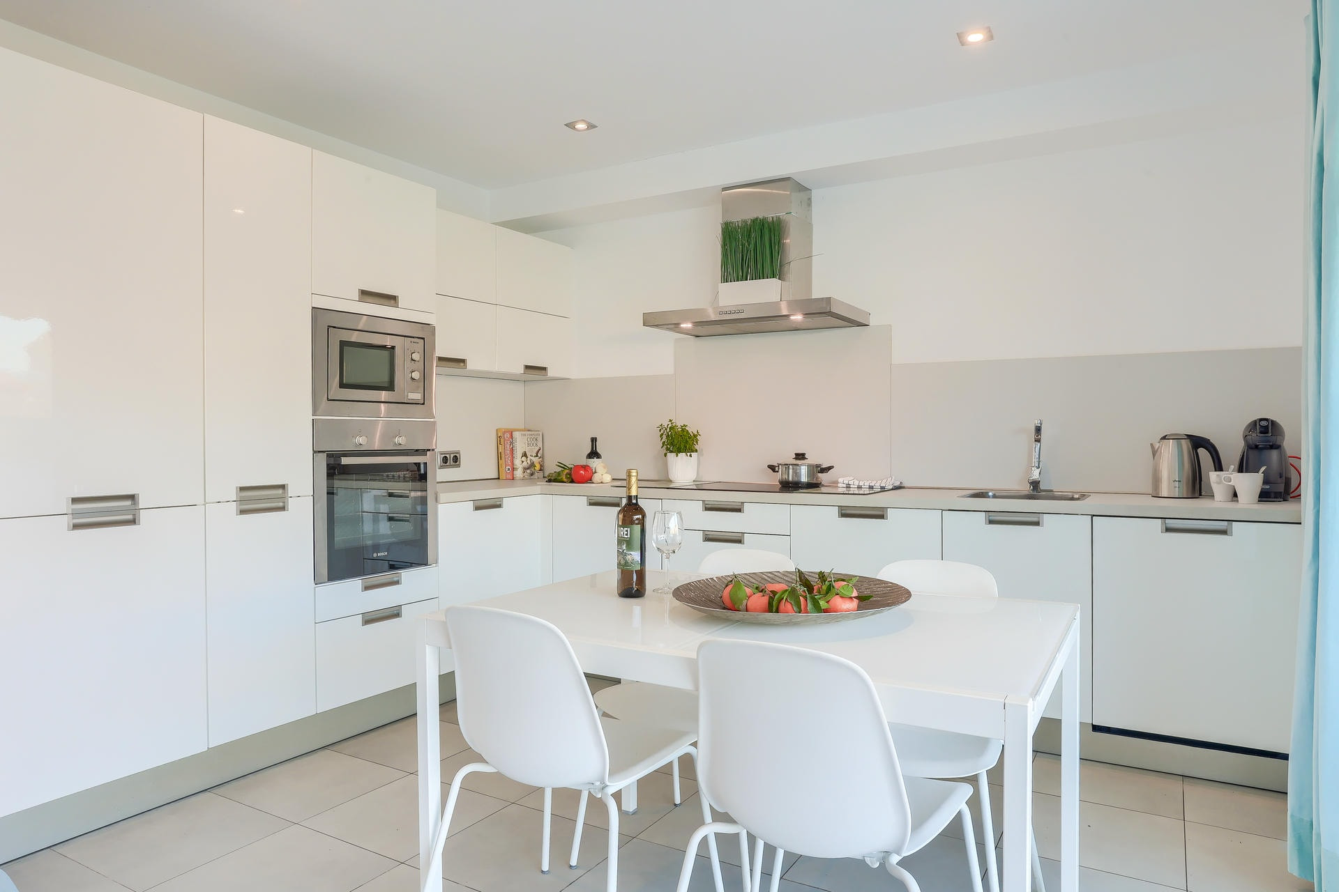 La cocina está completamente equipada e incluye lavavajillas, microondas, placa eléctrica, nevera y todos los elementos esenciales para cocinar. Junto a la cocina hay una pequeña terraza práctica, donde cuatro personas pueden comer o disfrutar de una bebida refrescante.