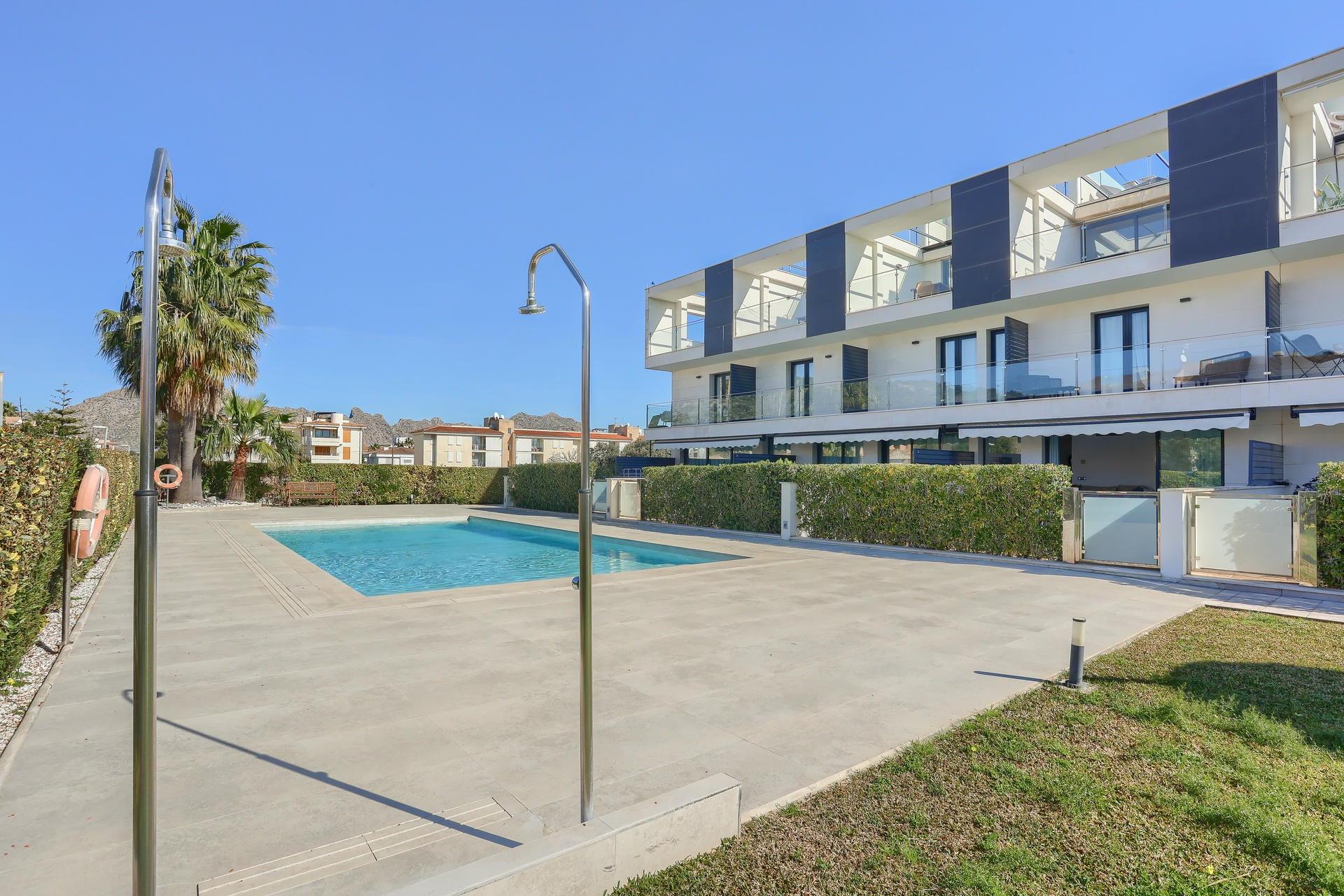 Esta es la opción ideal para una familia que busca un apartamento moderno en planta baja con una piscina comunitaria de buen tamaño, cerca de la playa.