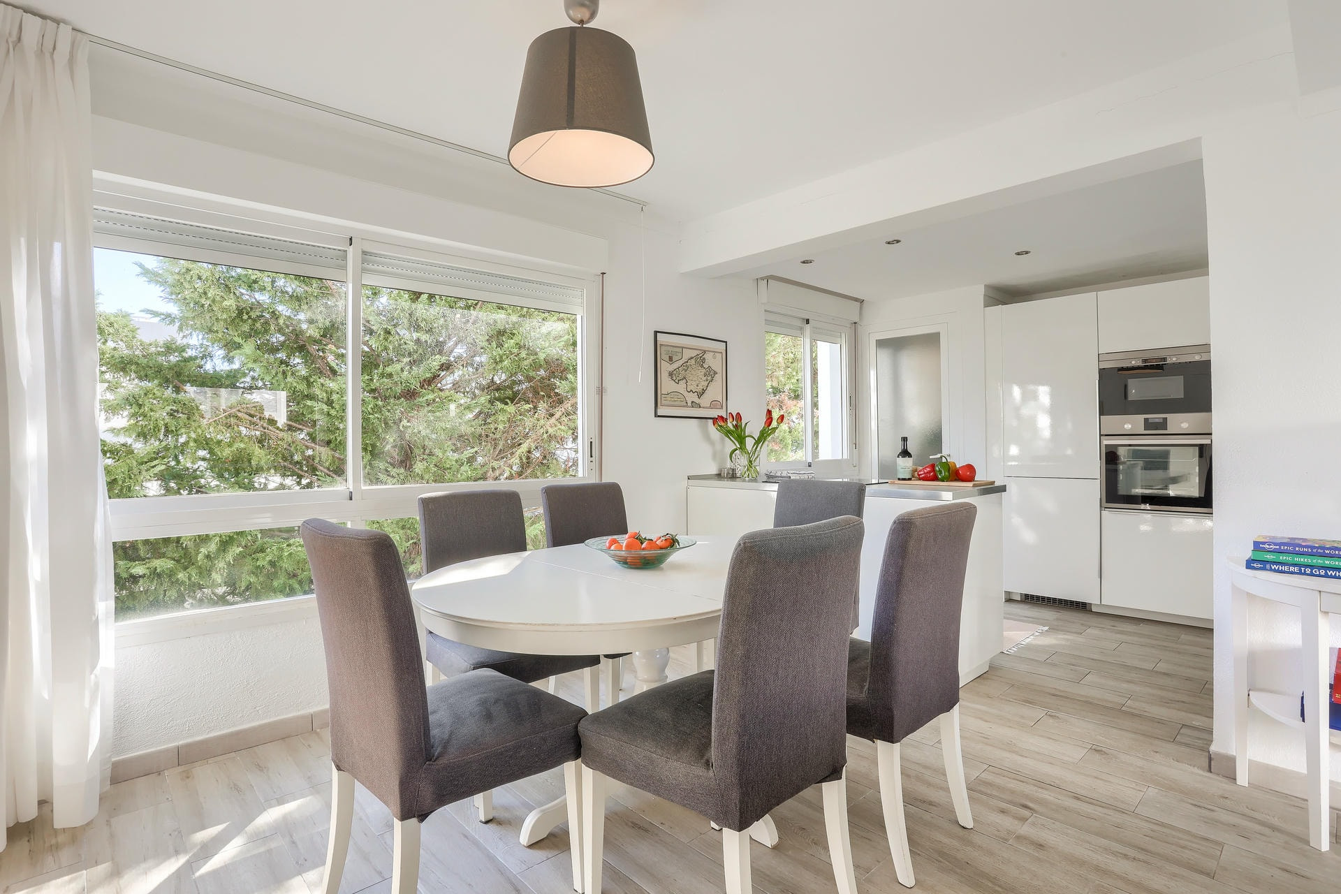 Hay tres dormitorios, uno grande de matrimonio, una habitación con dos camas individuales y una habitación con literas. Convenientemente hay dos baños, uno con bañera (ideal para niños pequeños) y otro con ducha de paseo.
