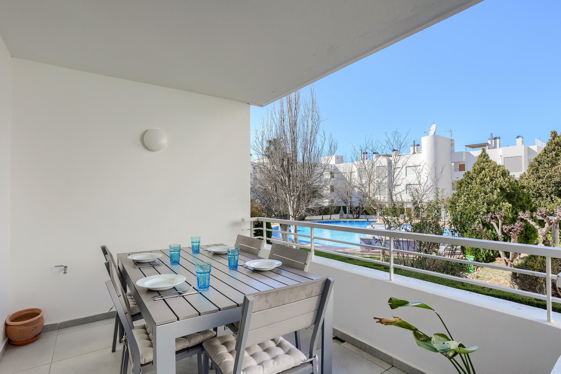 Este apartamento está en el bloque Brite. Tiene una terraza encantadora, con una mesa de comedor y sillas donde puedes disfrutar de deliciosos almuerzos con vistas a la piscina y las montañas.