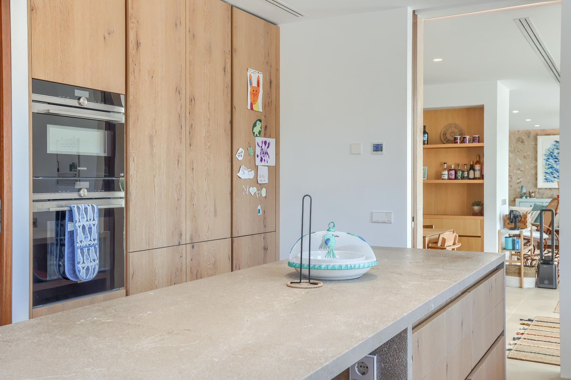 The living room is beautifully furnished, striking just the right balance between style and comfort. Bright Mediterranean fabrics and paintings with luxurious white sofas. The kitchen is smart and very well equipped.